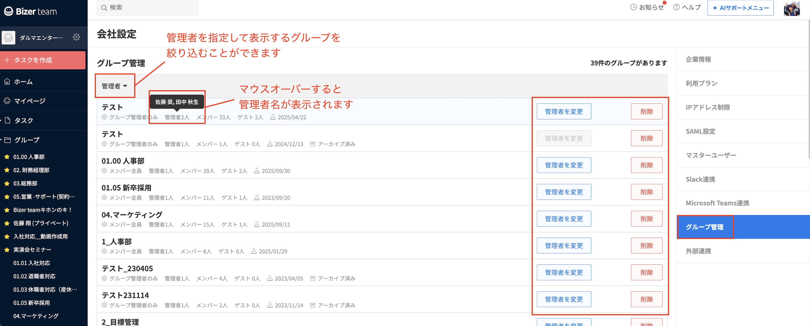 2. 画面右側メニューの「グループ管理」をクリックし対象グループの「管理者を変更」もしくは「削除」をクリック