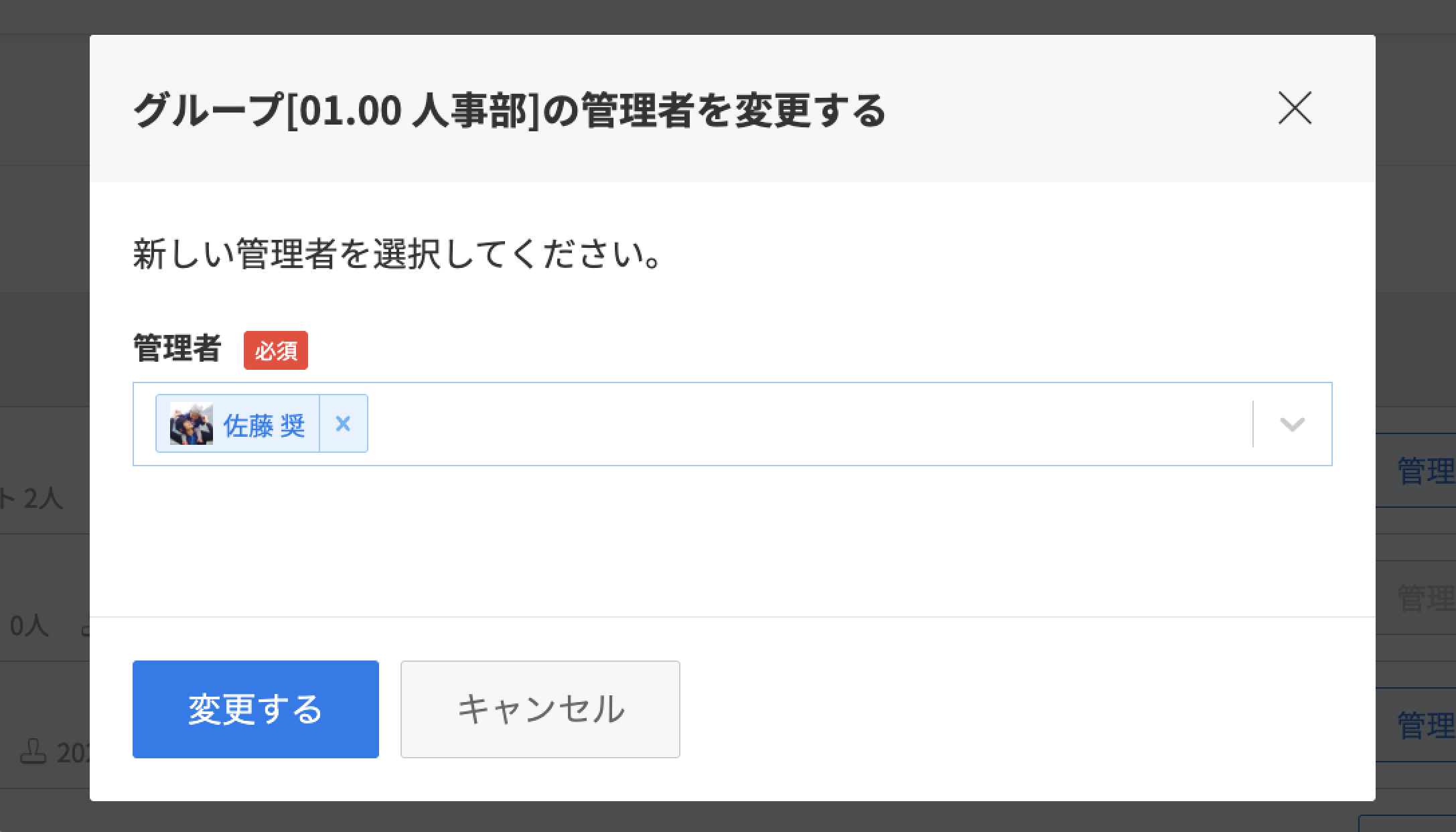 ※対象グループのメンバーに有効ユーザーが一人しかいない場合、「管理者を変更」は行なえません。