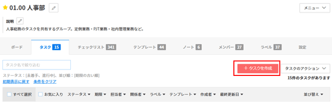 設定が完了したら、画面下部の「作成する」ボタンをクリックしてタスクを作成します。テンプレートに登録されたチェックリストが自動的にタスクに反映されます。